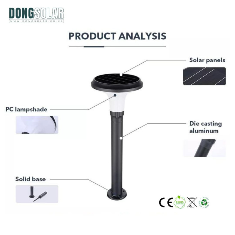 Elegant solar bollard (Ø26 cm, 70 cm tall) with 15W warm white LED, auto dusk-to-dawn sensor, and durable IP65 build. Perfect for pathways and gardens.