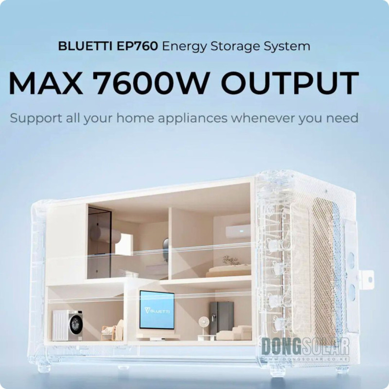 7,600W inverter with 4,920 Wh (5 kW) base capacity battery, expandable. Offers UPS mode, AC + solar input, smart control & modular design for home backup systems.